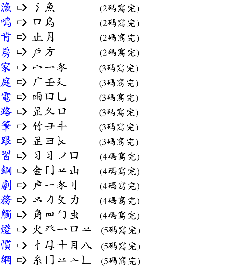 註:在實際打字時,您只要輸入前面二個字根及最後一個字根即可。